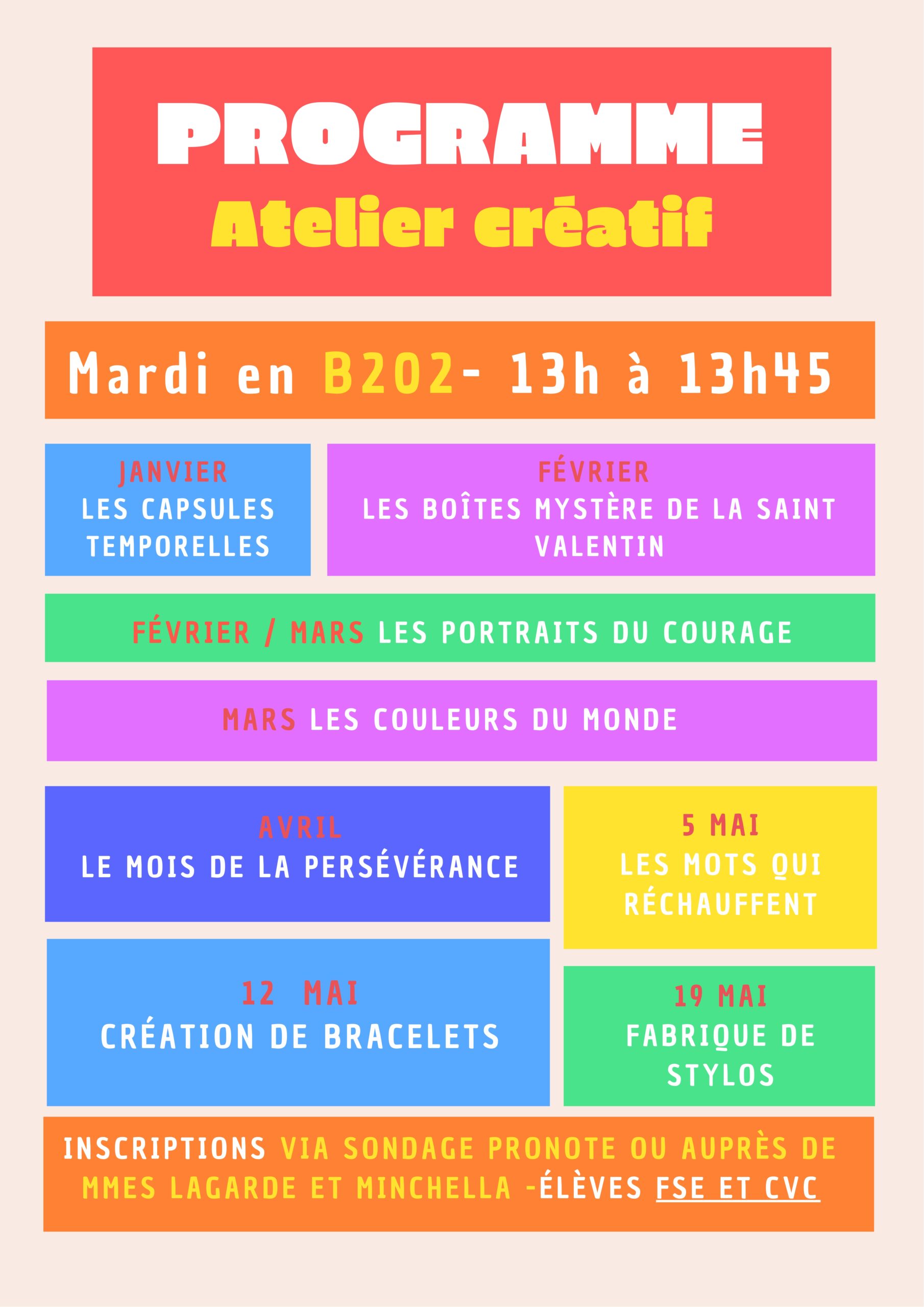 Celui-ci se dĂ©roulera les mardis de 13h Ă 13h45, en salle d’Arts Plastiques (B202) et est proposĂ© aux Ă©lèves du FSE et du CVC. Ces derniers peuvent s’inscrire pour les sĂ©ances d’un ou plusieurs thèmes, le nombre d’Ă©lèves Ă©tant limitĂ© Ă 10 pour chaque thème.