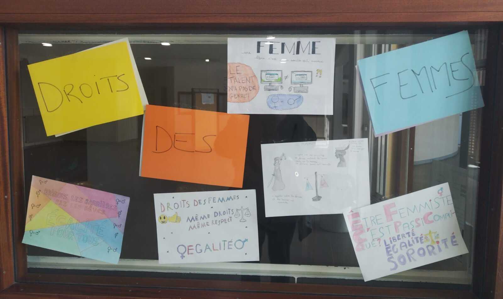 Dans le Hall B les élèves peuvent observer ces affiches qui ont toutes pour engagement de défendre les droits des femmes.