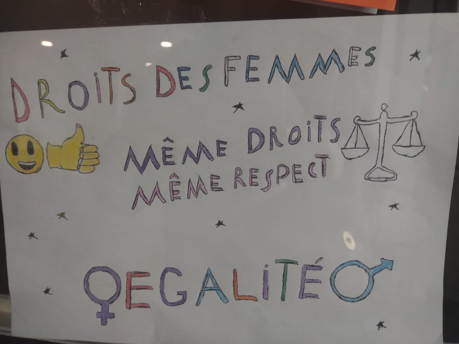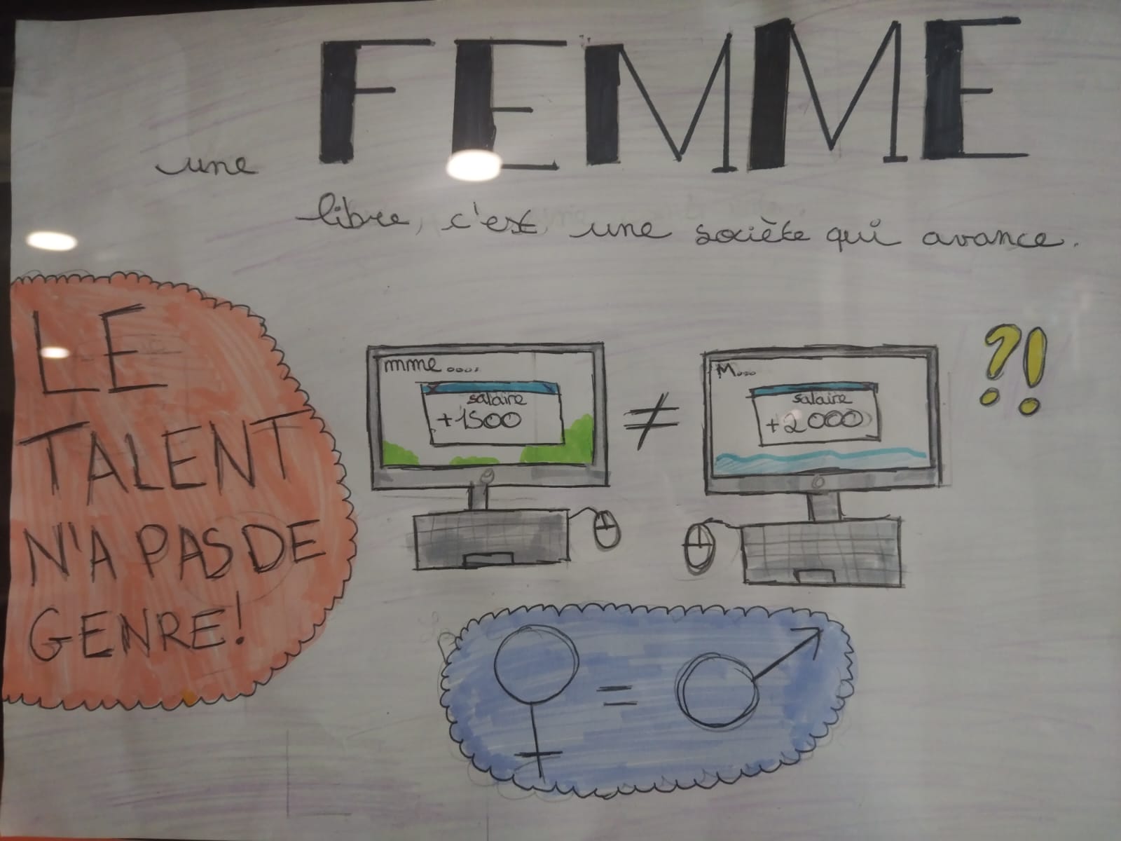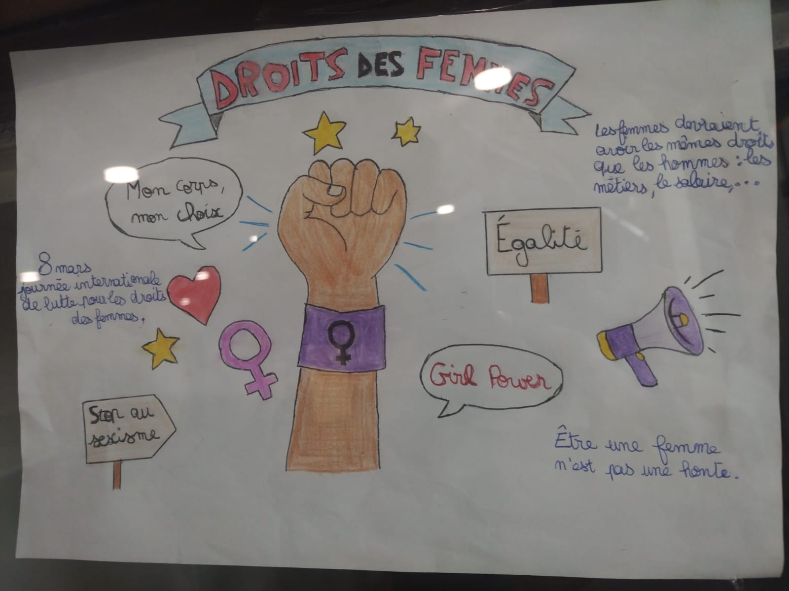Ă€ l’occasion de la JournĂ©e internationale du droit des femmes (8 mars) les Ă©lèves de 4e4 ont imaginĂ© et dessinĂ© des affiches pour dĂ©fendre l’Ă©galitĂ© hommes-femmes.